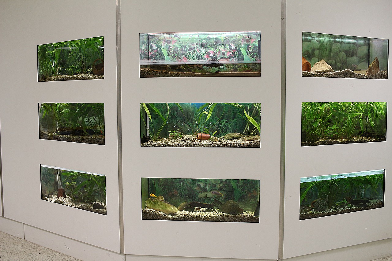Nicht immer alle Becken sind mit Süßwasserfischen besetzt. Im Laufe der Jahre gab es beispielsweise auch Stabheuschrecken, Süßwassergarnelen und Axolotl. Zurzeit wird ein Becken von einigen Kammmolchen bewohnt.