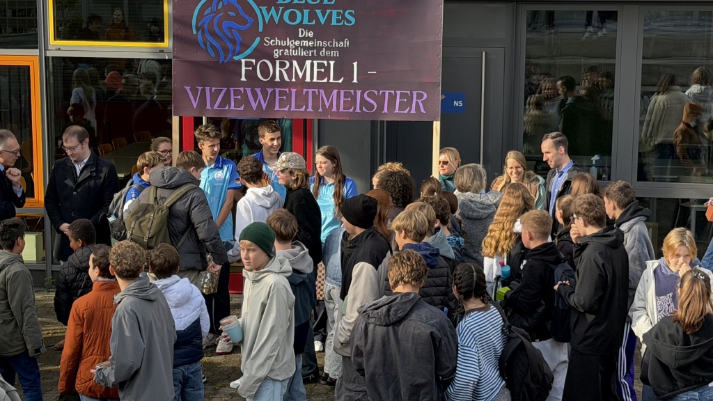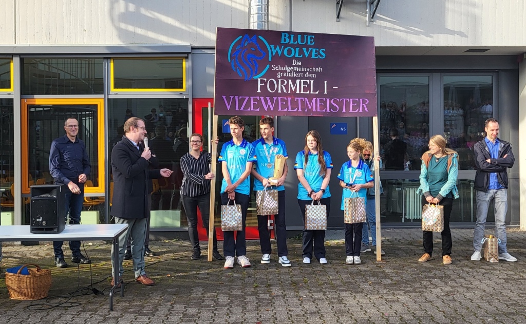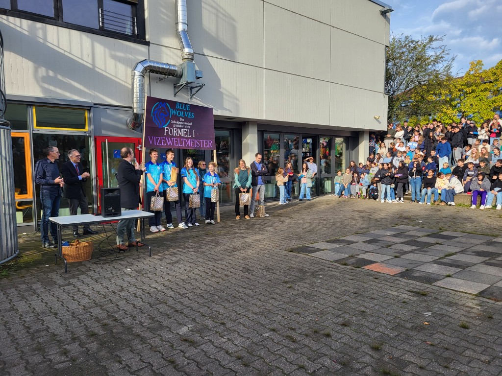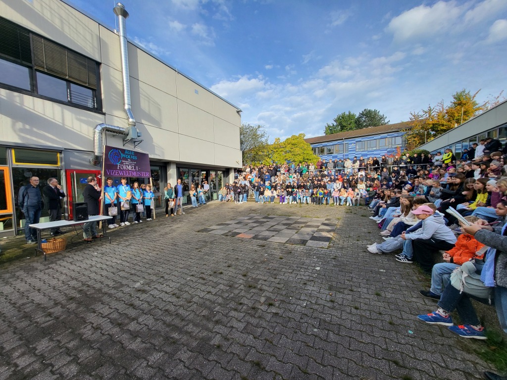 Unsere Vizeweltmeister der STEM-Racing World Finals, die „Blue Wolves“, sind am 8. Oktober 2025 aus Singapur heimgekehrt – und wurden auf dem Pausenhof des Tausgymnasiums feierlich von der gesamten Schulgemeinschaft empfangen.